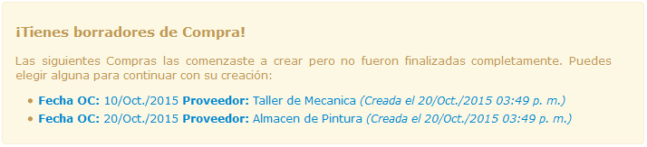 Al ingresar nuevamente a la creación de una compra, el sistema le permitirá visualizar un listado con los borradores de las compras que usted no ha finalizado (grabado).
