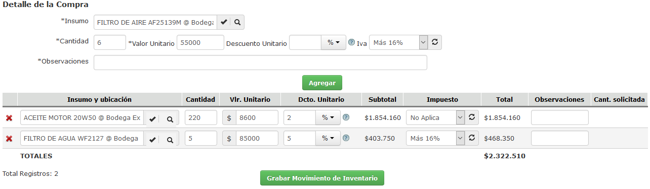 Debe tener en cuenta que si usted invoca un borrador de compra y su origen es una orden de compra, usted podrá editar los valores, pero no podrá adicionar más repuestos en la compra.