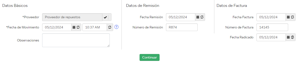 • Debe ingresar datos en el campo Factura Proveedor o Remisión Proveedor.