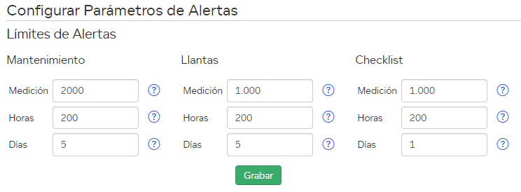 La configuración de los tiempos en la emisión de las alertas se constituye en un paso fundamental para la gestión del mantenimiento, ya que de ésta dependerá que las alertas emitidas lleguen en el momento justo y con la anterioridad requerida para reaccionar ante dicha alerta. Es importante anotar que no sólo se pueden configurar los tiempos de anterioridad para las alertas de mantenimiento sino también de llantas y listas de chequeo.