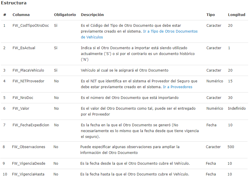 - La plantilla de Importación de excel completo presenta un total de 8 columnas, de las cuales sólo 3 columnas son de carácter obligatorias. El resto de columnas son opcionales.