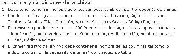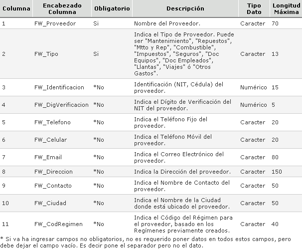 Si usted ya posee el listado de Proveedores de su empresa en algún archivo o en una aplicación externa que pueda exportarlas a un archivo, cloudFleet ofrece la posibilidad de importar esa información directamente desde un archivo plano evitando así la creación manual de las mismas.