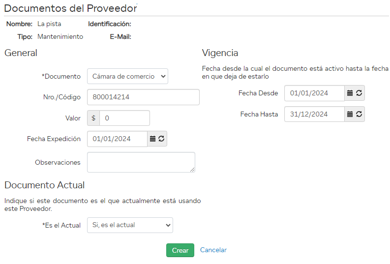 - De la sección** "General" cabe destacar el campo "Documento". Seleccione de la lista desplegable predefinida por el usuario, el tipo de documento que desea agregar al proveedor.