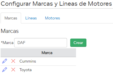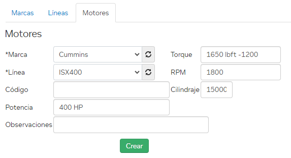 Aquí podrá definir la marca y la línea de cada motor; estos conceptos deben ser creados previamente.
