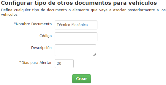 Configure aquí cualquier tipo de documento o elemento que vaya a asociar posteriormente a los vehículos/equipos, son una parte importante para hacer una buena gestión documental de los vehículos. Ejemplo: Revisión Técnico Mécanica