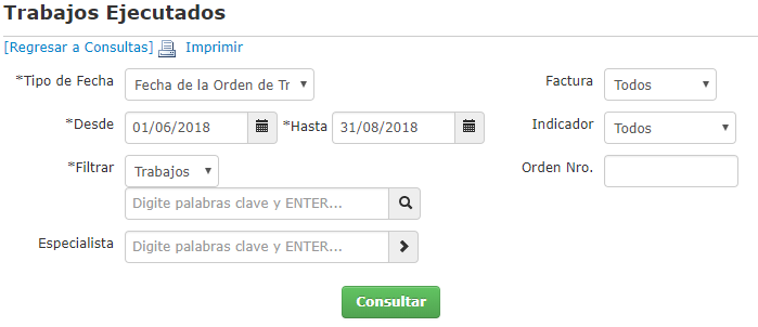 - Cuenta con diferentes parámetros para filtrar su búsqueda (Fecha, Trabajos, Especialistas, Indicador...)