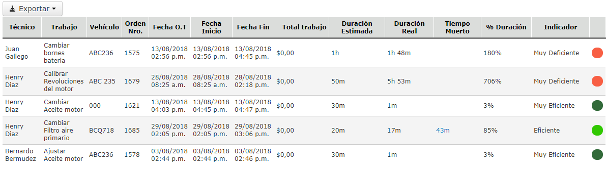 Con esta consulta usted podrá visualizar todos los trabajos que han realizado los técnicos, con todos sus detalles, así como el tiempo estimado y la duración real, tomando en cuenta estos tiempos el sistema compara el tiempo estimado y el real, y mostrara tanto en porcentaje como un indicador sobre la eficiencia del técnico.