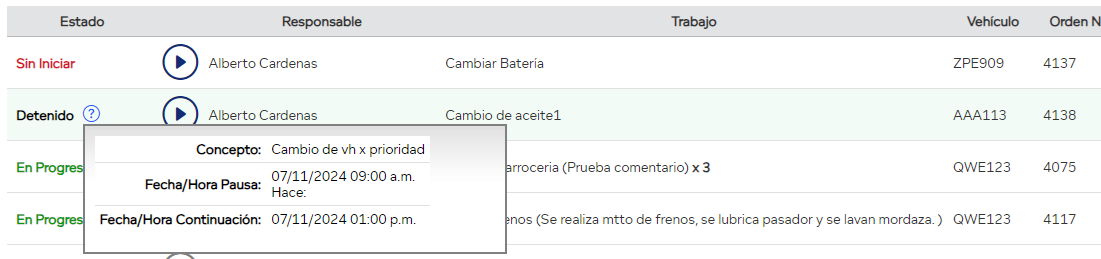Situé el puntero sobre , y ampliara la información del trabajo que se encuentra Detenido.