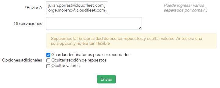 - Opciones adicionales, una casilla de verificación por si desea que el sistema le recuerde ese destinatario en los próximos envíos, y una casilla de verificación parar incluir los repuestos y valores en el Informe.