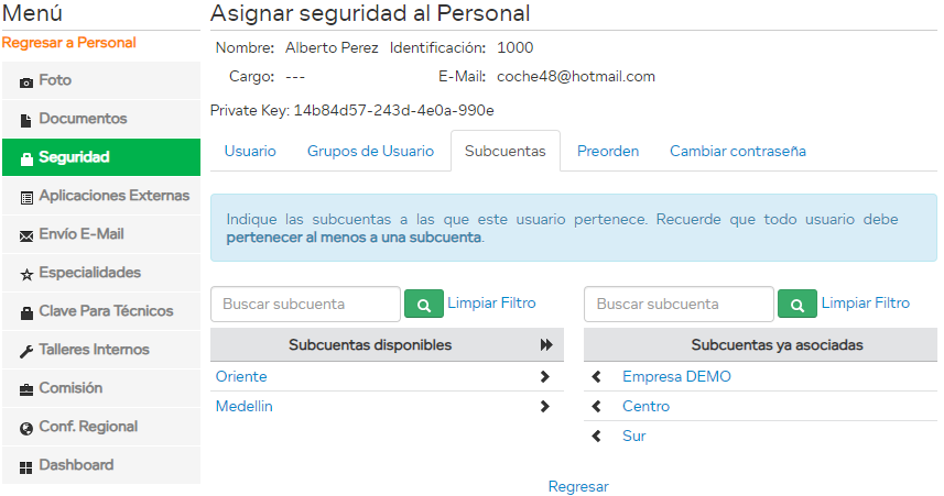 Asociando el personal a las subcuentas puedes restringir que una persona solo pueda ver y/o ejecutar las diferentes opciones, solo a los vehículos asignados a la misma "Subcuentas". De esta forma, se asegura que los usuarios sólo están accediendo a la información que cada uno requiere para sus funciones.