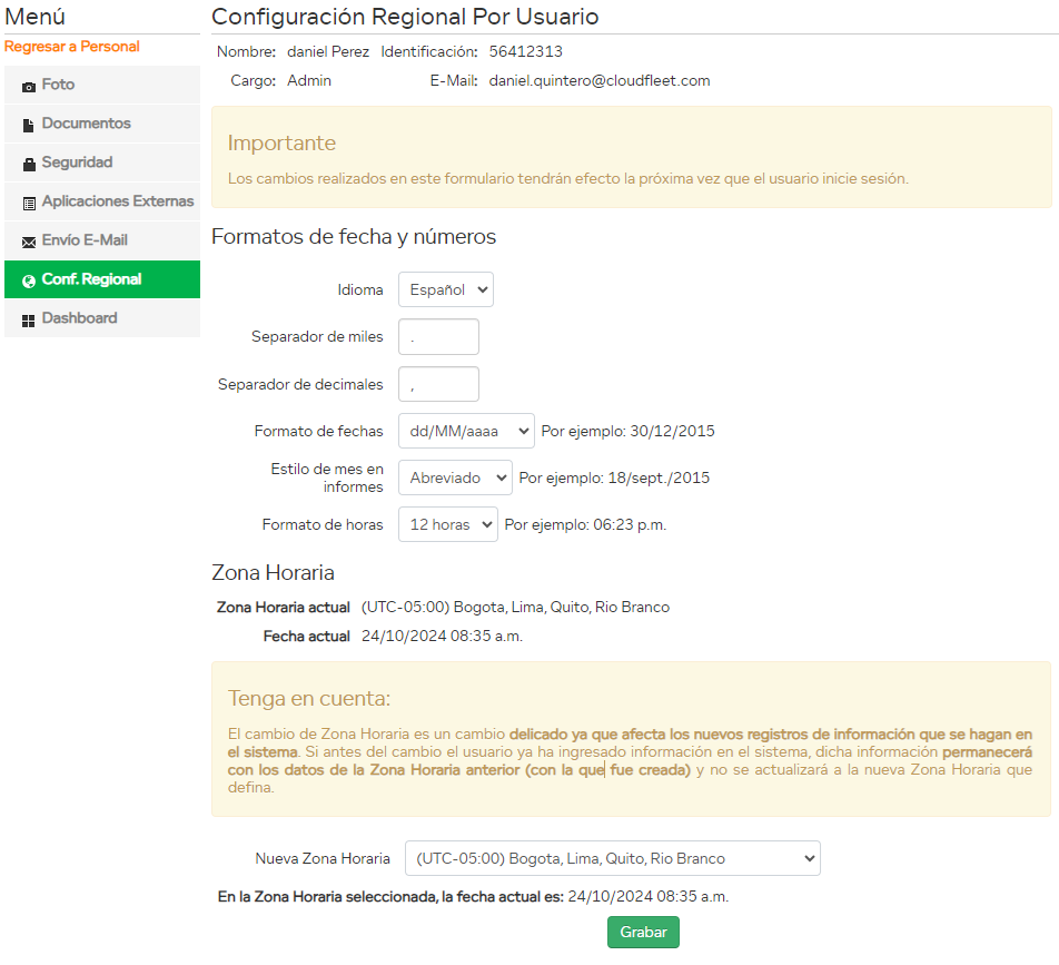 El sistema le permite configurar por cada usuario el separador de miles y de decimales que usará en la aplicación. Cabe anotar que la configuración que establezca en la aplicación prevalecerá sobre la configuración de su computador (configuración regional) aunque para efectos de visualizar correctamente la información al momento de exportar datos, se recomienda que ambas configuraciones, la de cloudFleet y de su computador sean las mismas.