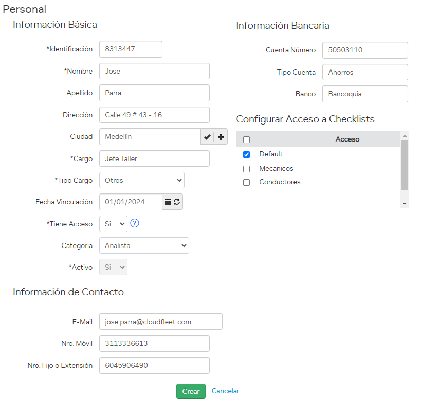 8. Configurar Accesos a Checklist: en el caso que la persona sí tenga acceso al sistema, se habilitara esta opción, en la cual podrá indicar si este usuario tendrá acceso a los checklist y  que accesos se le asignara.