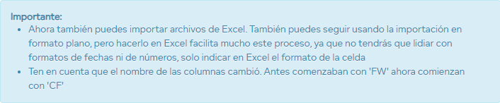 - El archivo de excel debe contener exactamente las mismas columnas que propone la plantilla e identificadas con el nombre exacto de cada columna.