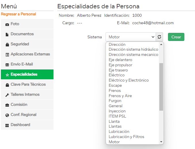 Mediante esta opción, se le podrá especificar a una persona la Especialidad Técnica que posee, basada en los sistemas y subsistemas creados en la cuenta y en los cuales están agrupados los trabajos de mantenimiento. por ej: sistema dirección, sistema lubricación, sistema eléctrico, etc. para hacerlo siga estos pasos:
