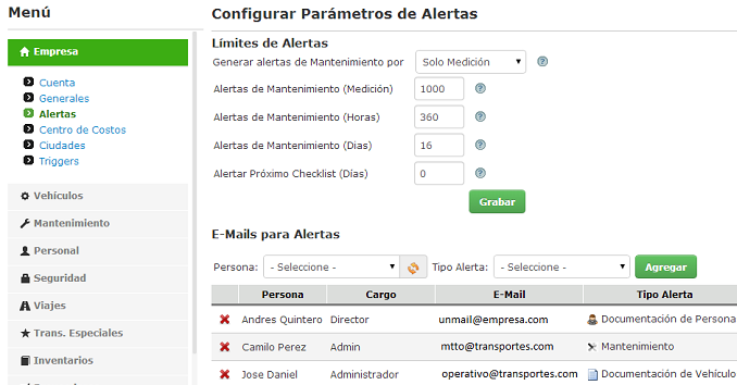 Ademas de muestrar las alertas en el Menú de alertas", el sistema envía por Correo Electrónico la alerta de los vencimientos de la documentación, con los días de anticipación que usted configure y a las personas que usted decida. Esta configuración del tiempo y del personal puede hacerla por la opción Empresa > Configuración > Empresa > Alertas