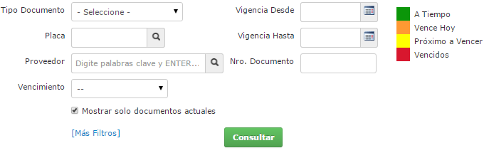 - El sistema le ofrece múltiples opciones de filtrar las consultas de documentos. Haga las combinaciones según sus necesidades, ejemplo: Consulta de seguros de toda la flota de camiones, consulta de todos los seguros que son suministrados por determinado proveedor, consulta de los documentos que se vencen en la próxima semana, etc.