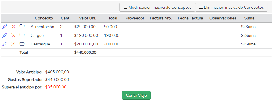 • Sección Inferior, visualizara los gastos por conceptos, y un resumen de los gastos soportados y el valor del anticipo, el sistema le indicara si el anticipo es superado por los gastos soportados.