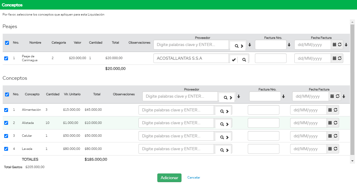 Casilla de verificación, seleccione los conceptos que desea adicionar a la liquidación.