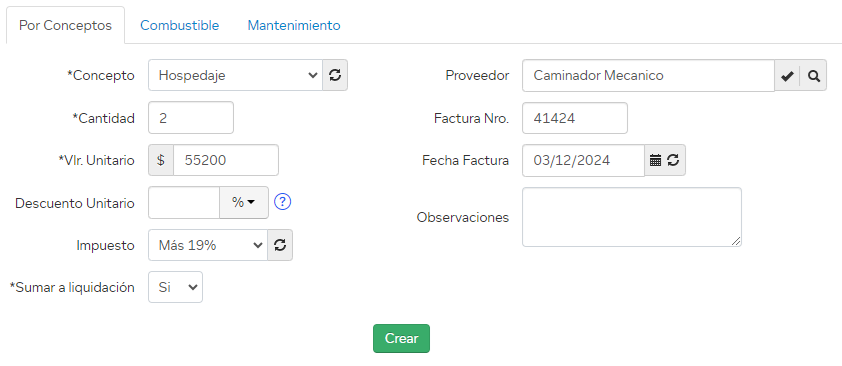 Encontrara dos pestañas en las cuales podrá indicar los gastos de combustible o de mantenimiento asociados al viaje, se pueden registrar estos gastos para el vehículo principal o para los vehículos vinculados. Debe tener en cuenta, todos los gastos quedaran asociados al viaje, recuerde indicar si el gasto de combustible o mantenimiento suma a la liquidación del conductor.