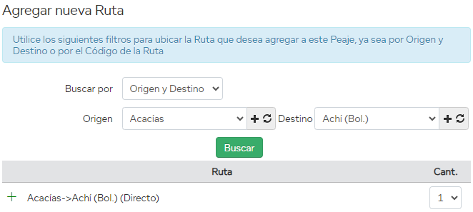 - Para agregar la ruta correspondiente al peaje haga clic sobre el
