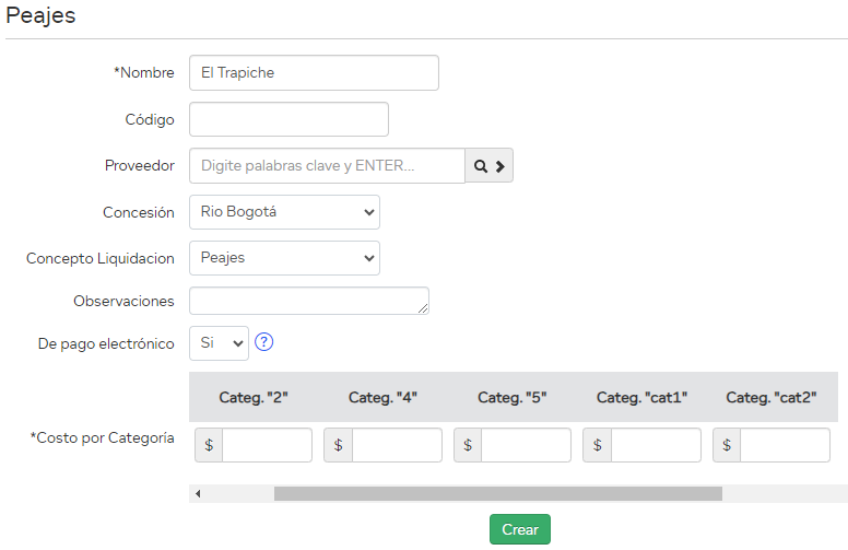 El sistema le permite crear peajes y asignar un valor a cada categoría de peaje, y aplicar esos valores a una ruta o rutas y vias determinadas.