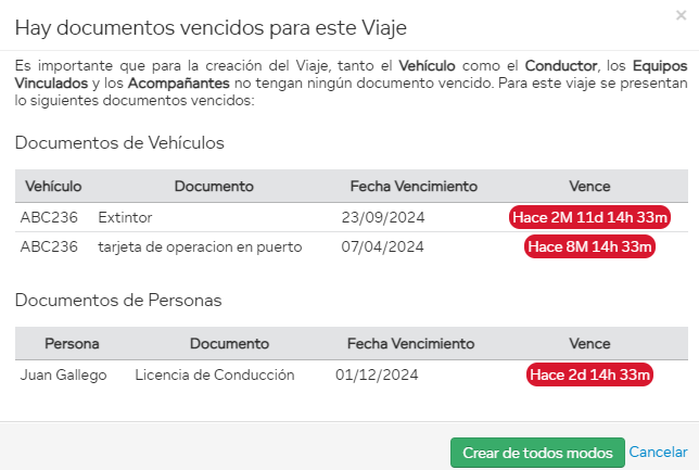 En el caso que un vehiculo o conductor tenga documentos vencidos registrados en el sistema, aparecerá una alerta informando cuales son los documentos vencidos.