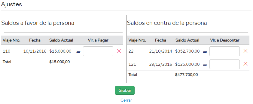En el momento que usted visualice el enlace de , usted puede hacer ajustes a los saldos del conductor, ya sean a favor o en contra.