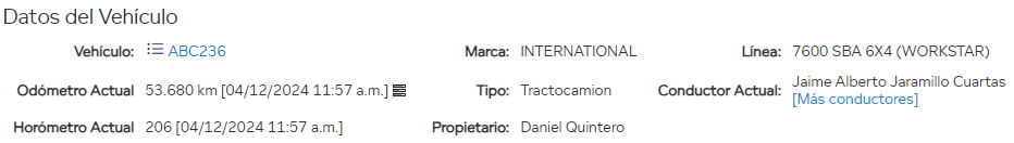 Muestra la información básica del vehículo, como los equipos vinculados al vehículo, solo debe dar clic sobre el enlace Ver Equipos Vinculados.